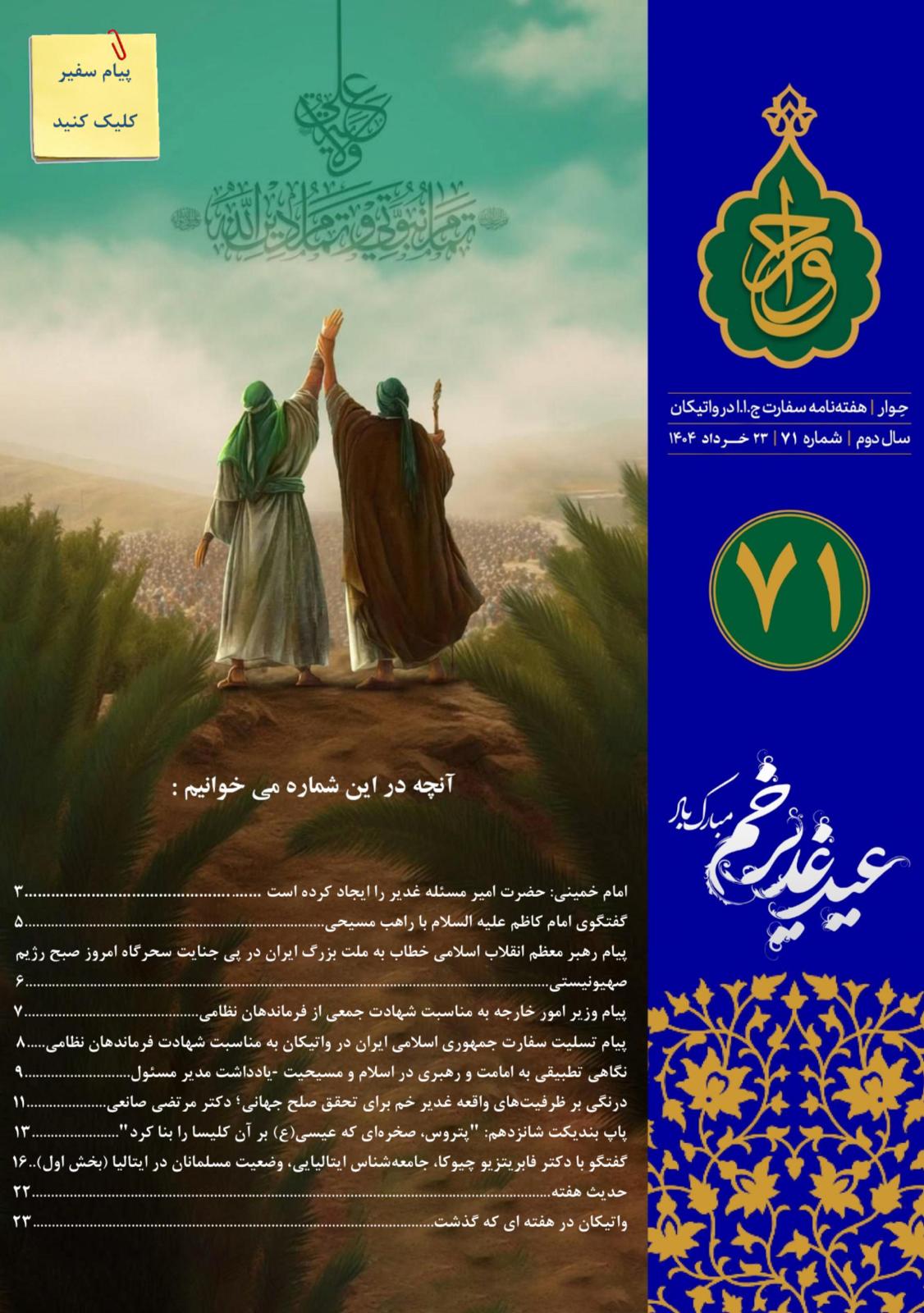 انتشار هفتادو یکمین شماره هفته نامه سفارت جمهوری اسلامی ایران در واتیکان