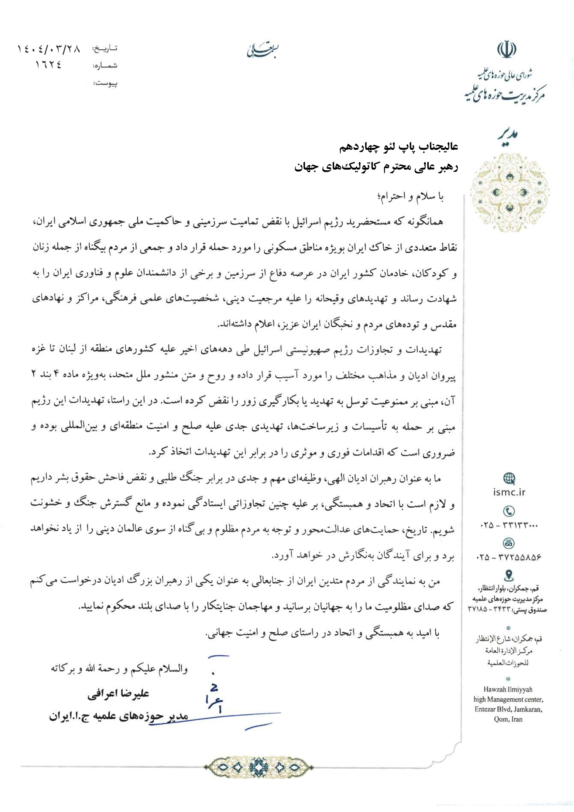 نامه آیت الله اعرافی مدیر حوزههای علمیه جمهوری اسلامی ایران خطاب به پاپ لئون چهاردهم رهبر کاتولیک های جهان در محکومیت یورش رژیم صهیونیستی به کشورمان و تهدید وقیحانه مقام مرجعیت دینی