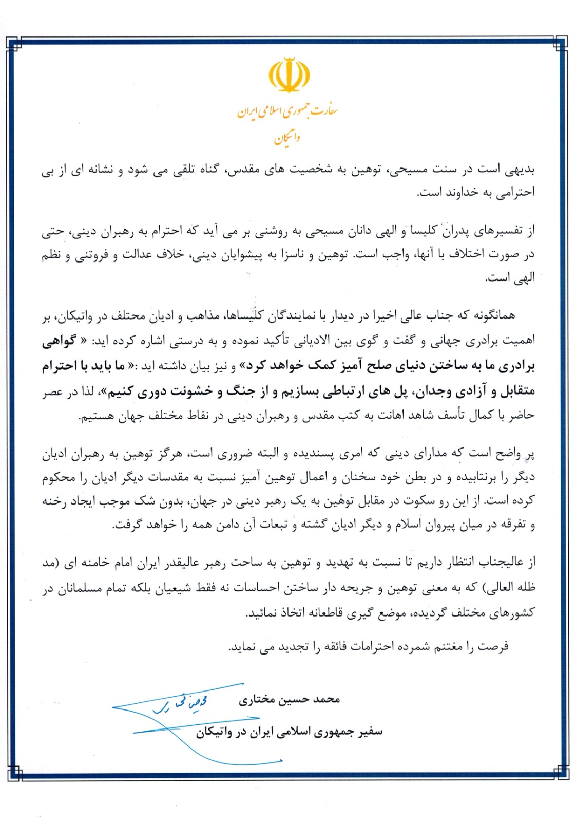 همانگونه که جناب عالی اخیرا در دیدار با نمایندگان کلیساها، مذاهب و ادیان محتلف در واتیکان، بر اهمیت برادری جهانی و گفت و گوی بین الادیانی تأکید نموده و به درستی اشاره کرده اید: « گواهی برادری ما به ساختن دنیای صلح آمیز کمک خواهد کرد» و نیز بیان داشته اید :« ما باید با احترام متقابل و آزادی وجدان، پل های ارتباطی بسازیم و از جنگ و خشونت دوری کنیم»، لذا در عصر حاضر با کمال تأسف شاهد اهانت به کتب مقدس و رهبران دینی در نقاط مختلف جهان هستیم.