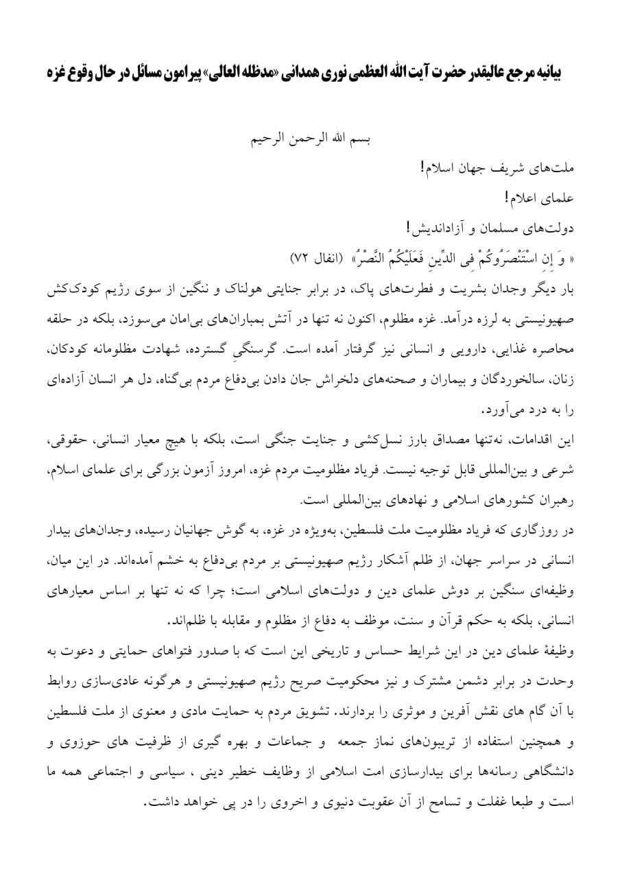 بیانیه مرجع عالیقدر جهان تشیع آیت الله العظمی حسین نوری همدانی درباره شرایط غزه