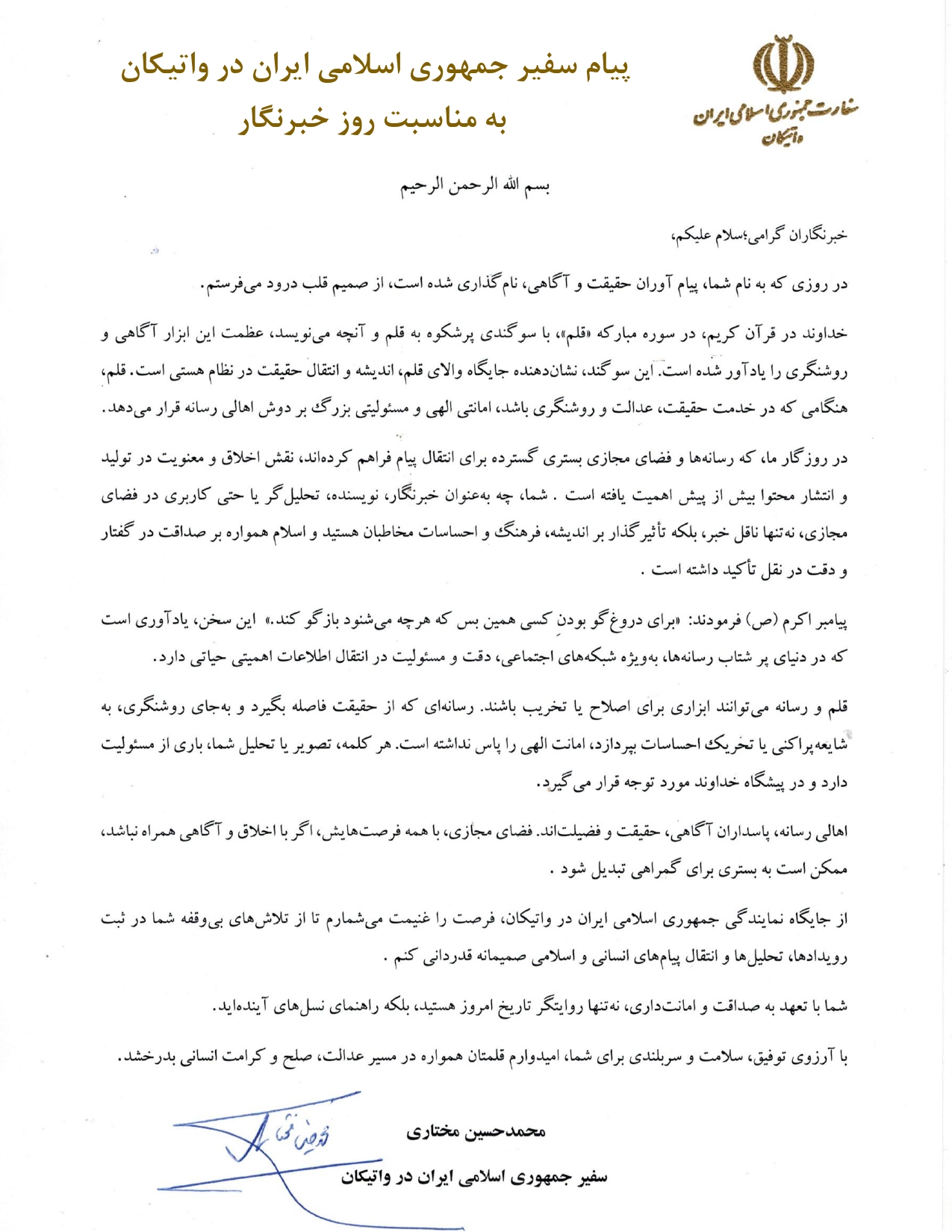 پیام سفیر جمهوری اسلامی ایران در واتیکان به مناسبت روز خبرنگار